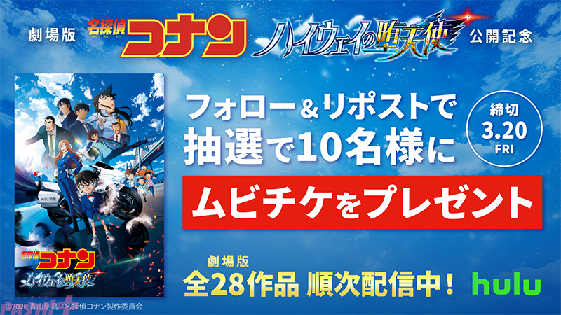 3月15日(日)からHulu公式X(旧Twitter)にて最新作『名探偵コナン ハイウェイの堕天使』のムビチケが抽選で当たるプレゼントキャンペーンの実施が決定しました。詳細はHulu公式Xの投稿をお待ちください。