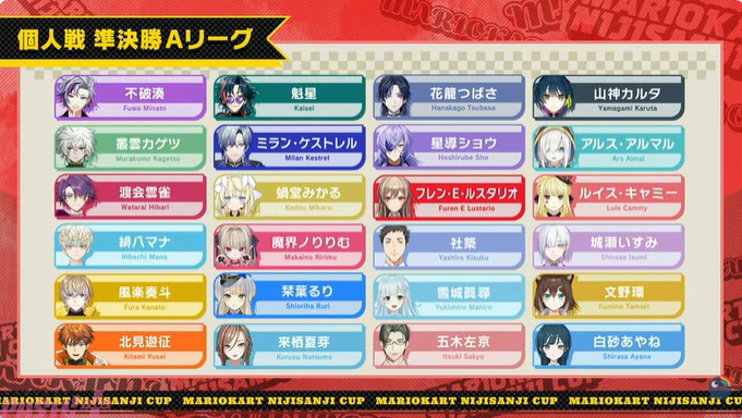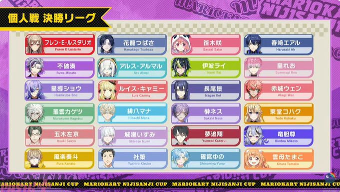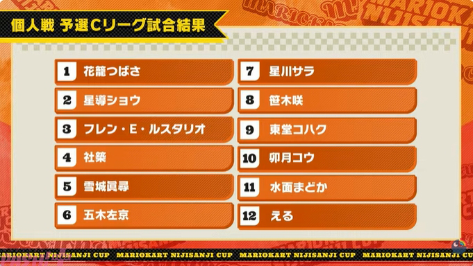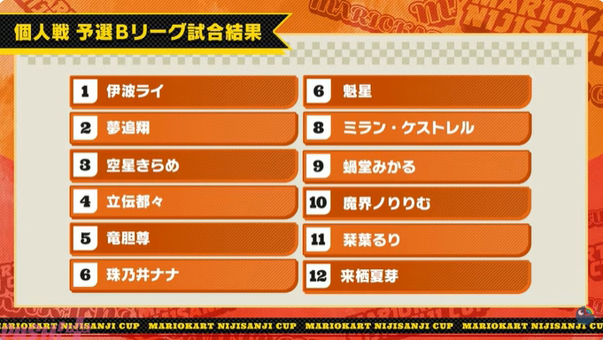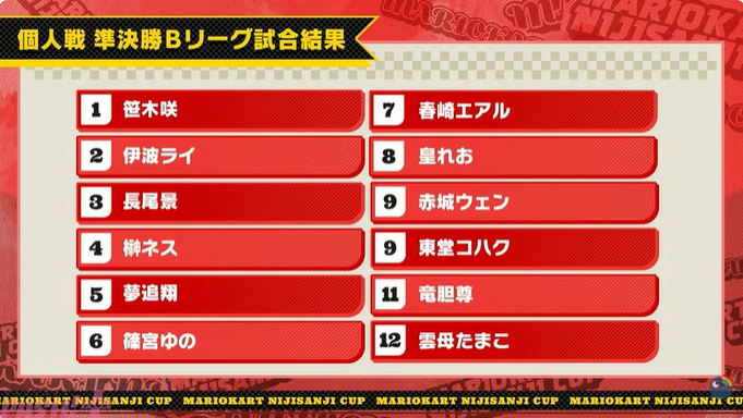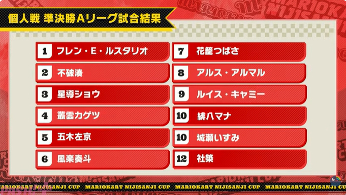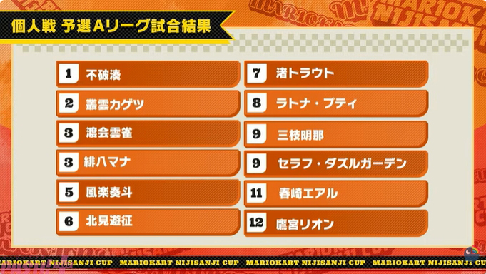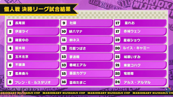 予選Aリーグからレインボーロードの連続選択や延長戦突入と波乱の幕開けとなった個人戦は、アイテムボックス付近に上位が固まるタイミングでサンダーを発動する不破湊やキラーで1位を掻っ攫う立伝都々など、熟練者たちの走行スキルの高さやアイテムを使った駆け引きで手に汗を握る展開に。