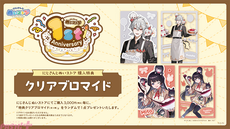 にじさんじ ぬいストアにてご購入3,000円(税込)毎に、「特典クリアブロマイド(全4種)」をランダムで1点プレゼントいたします。