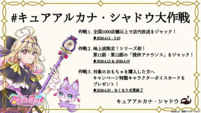 2026年4月12日(日)放送の第11話、4月19日(日)放送の第12話では、CM前後に流れる「提供アナウンス」をキュアアルカナ・シャドウが担当します。地上波放送でしか聞けない特別なアナウンスとなっていますので、ぜひテレビでお楽しみください!