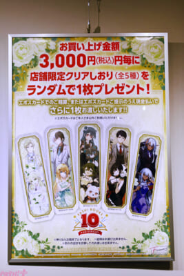 また、イベント限定ノベルティとして購入金額3,000円(税込)毎にランダムで「クリアしおり」がもらえる他、3,000円(税込)以上の購入でもらえる抽選券から応募できる店舗購入者限定キャンペーンでは、直筆サイン入り色紙を抽選で各1名にプレゼント! 各作品のファンはこちらも見逃せません!