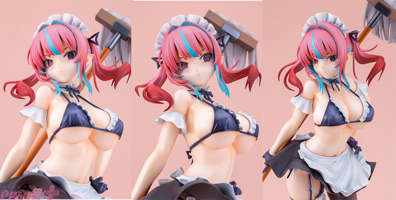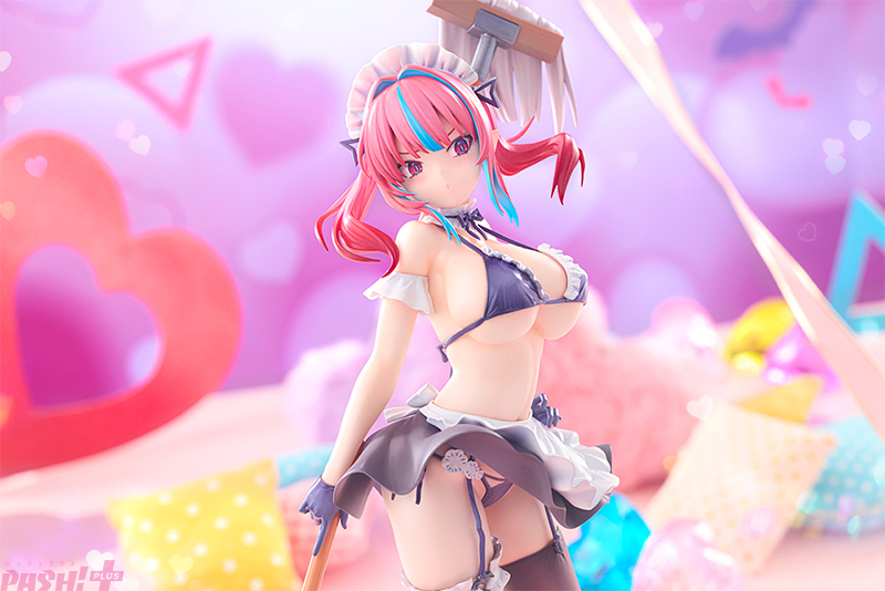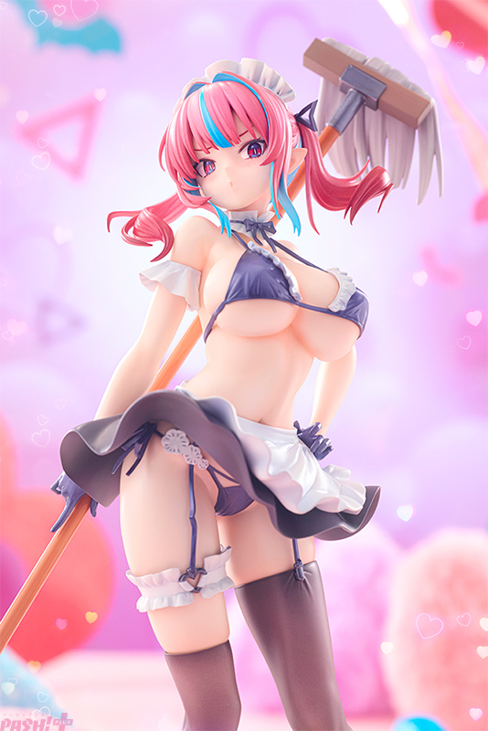 水着部分にはパール塗装を施し、艶やかで上質な質感を表現。豊満なバストや流れるようなボディラインを、より一層美しく引き立てています。また、フリルの繊細なしわや、スカートからさりげなく覗くガーターベルトショーツ、さらにイラストでは見えなかった背面に至るまで徹底的に造形。360度どこから見ても満足できる仕上がりです。
