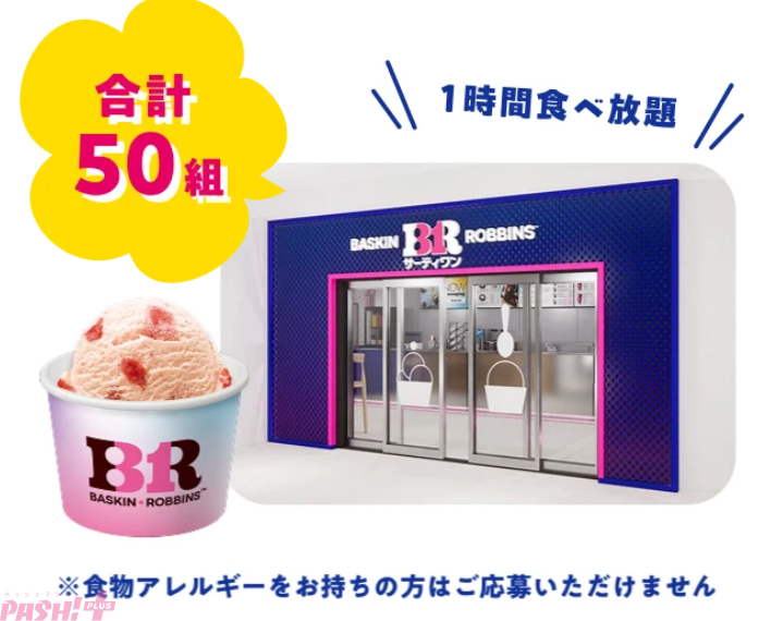 フレーバー総選挙・ダブル総選挙の両方へ投票いただいた方の中から、抽選で50組100名に、サーティワン貸し切り食べ放題イベントへご招待。後半戦からの参加でもまだまだ当選のチャンスはあるとのことなので、奮って投票ください。