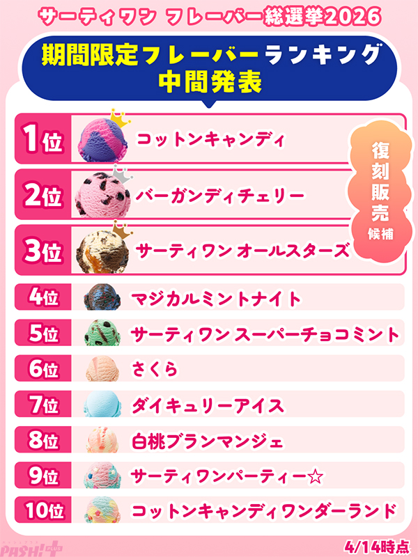 The post 「サーティワン フレーバー総選挙2026」ファンが選ぶ人気フレーバーやダブルの組み合わせは!? 昨年を上回る投票ペースの本企画より中間結果が発表 first appeared on PASH! PLUS.