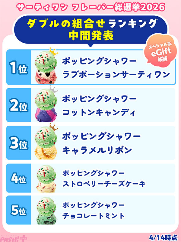 今回初開催となるダブルの組み合わせランキングでは、上位5位すべてにポッピングシャワーが入った組み合わせに。暫定1位は、ポッピングシャワー×ラブポーションサーティワンのサーティワンの大人気王道コンビです。