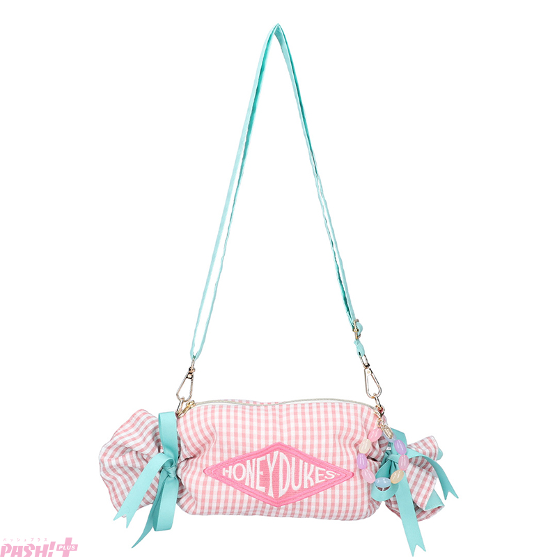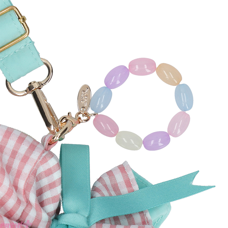 ピンク色のギンガムチェックとリボンのミントグリーンがかわいらしいデザインのキャンディ型ポシェットです。内生地はリボンと同色のミントグリーンで仕上げ、鍵やコスメの収納に便利な内ポケットが付いています。