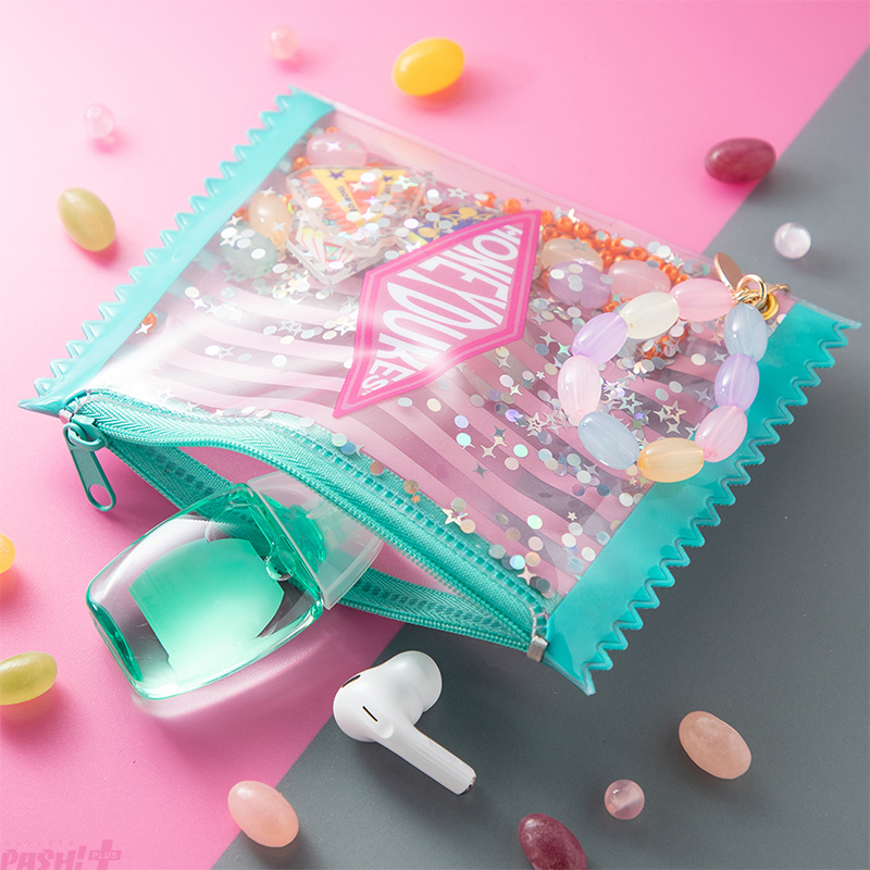 振ったり傾けたりすることでモチーフ同士がシャカシャカと音を立て、ビーズやラメがキラキラと輝きます。リップや絆創膏、薬などを収納可能なサイズ感で、中身が見える便利なクリア仕様です。
