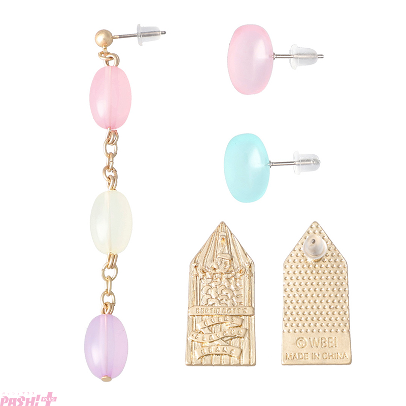 バーティー・ボッツの百味ビーンズのパッケージデザインを落とし込んだプレートピアスや色とりどりのビーンズを再現したゆらゆら揺れる三連ピアス、つるっとした質感がかわいらしいグリーンとピンクの一粒ピアスとのセットアイテムです。