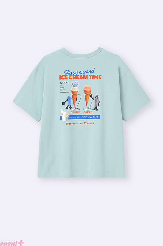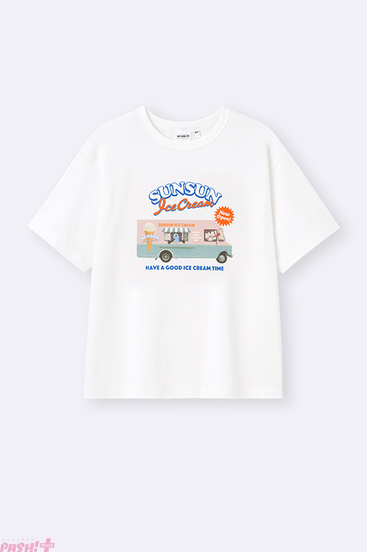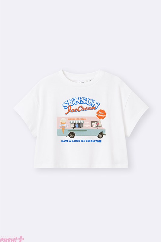 ラインアップは、アイスクリームショップワゴンやメニュー表などをデザインしたグラフィックTシャツや、アイスのフレーバーをイメージしたコットンパジャマなどこれからの暑い時期にぴったりなアイテムのほか、スンスンがチョコミントアイスから、ノンノンがバニラアイスから顔を出すデザインのミニポーチなども登場します。