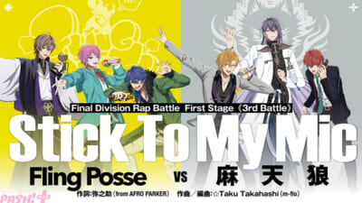 今回公開されたのは、『ヒプムビ』本編のFirst Stageよりシブヤ・ディビジョン“Fling Posse” VSシンジュク・ディビジョン“麻天狼”のバトル曲「Stick To My Mic」の1コーラス映像。今回公開された映像では、First Stageでぶつかり合うFling Posseと麻天狼によるバトルの熱気や緊張感が描かれており、Blu-ray発売への期待を一層高める内容です。