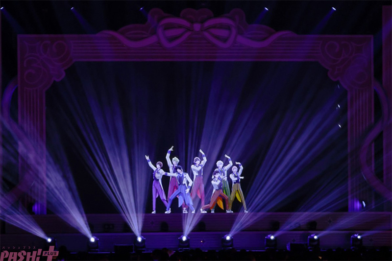 帝ナギの「Lovable midday」、桐生院ヴァンの「黄昏 Hugging」、日向大和の「オウマガトキ・メア」、鳳瑛二の「宵闇 Secret moon」と続き、気づけば物語はとっぷりと深い夜へ。まるで夢の世界へと誘われるかのような、没入感のあるひとときとなった。歌い終えた7人は、エンジェルたちが灯すペンライトの美しさに目を細め、感謝の言葉を届ける。さらに“対となる2曲”として、瑛一・ヴァン・大和による「Fall on me」と、綺羅・ナギ・瑛二・シオンによる「Beside you」を披露。異なる魅力が響き合い、会場は大きな歓声に包まれた。