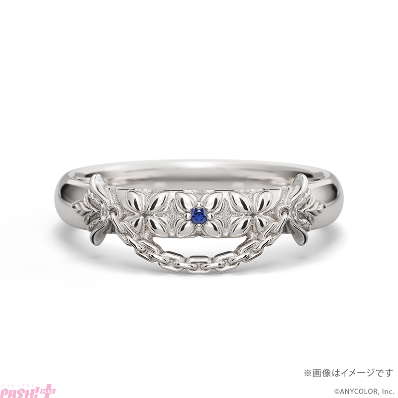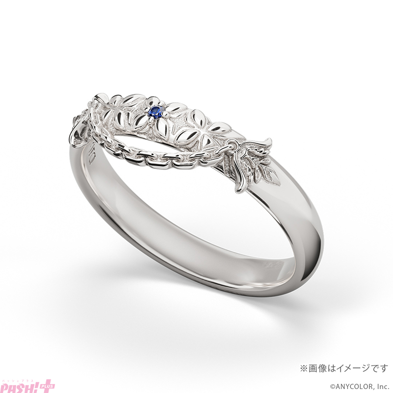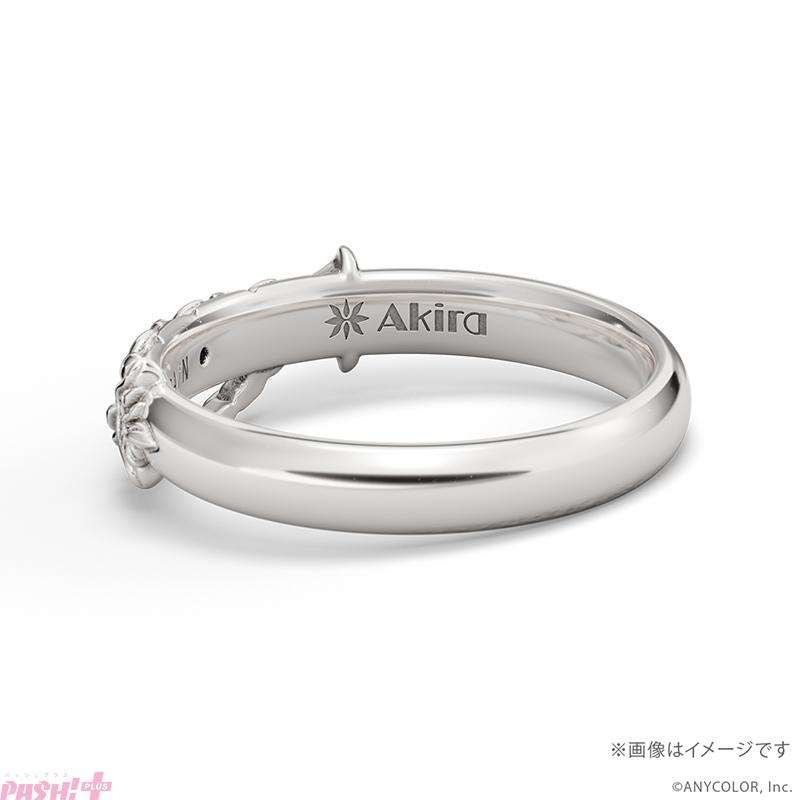 リング中央には石言葉に【誠実】・【知性】・【成功】の意味を持つ「ブルーサファイア」を留め、揺るぎない心で物事に向き合い、時に冷静にチームを正しい方向へ導く四季凪さんをイメージしています。内側には、モチーフのアイコンと名前(Akira)を刻印しています。素材は、カジュアルにお使いいただけるシルバー925を採用しました。