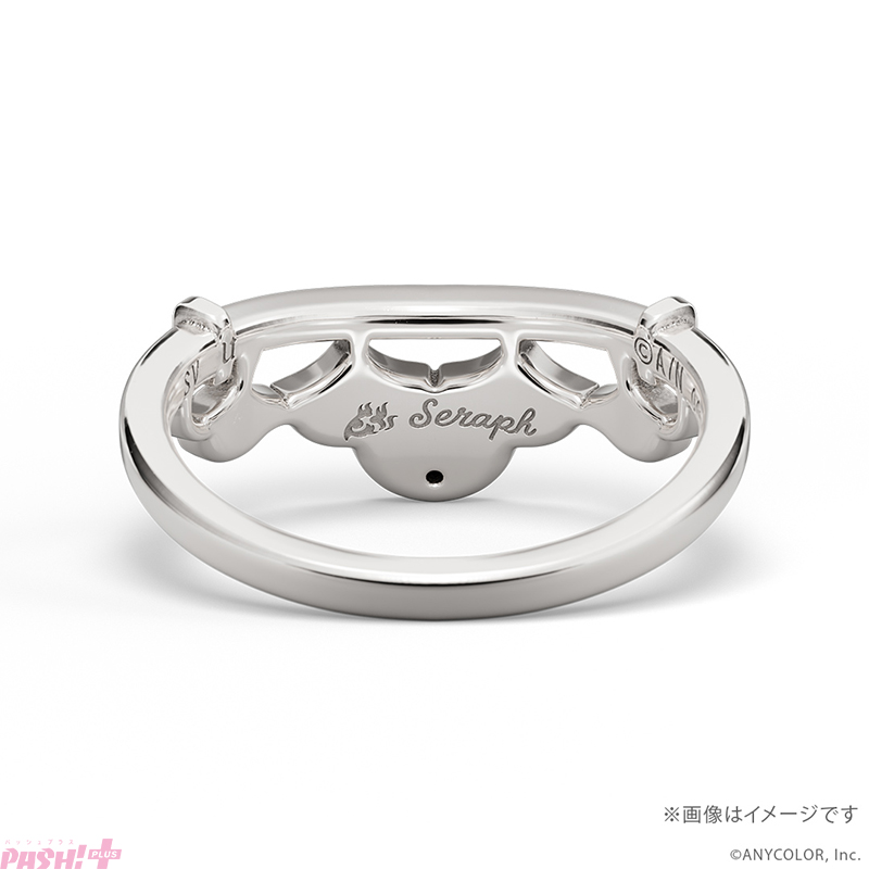 正面のモチーフ部分には石言葉に【情熱】・【真実】の意味を持つ「ガーネット」、【不屈】・【成功】の意味を持つ「ブラックトリートメントダイヤモンド」を留め、常に熱い気持ちで何事にも挑戦し、チームを成功へ導くセラフさんをイメージしています。内側には、モチーフのアイコンと名前(Seraph)を刻印しています。素材は、カジュアルにお使いいただけるシルバー925を採用しました。