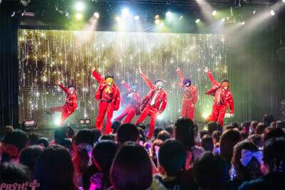 「Street Step」(原曲:すにすて – SneakerStep)では、軽やかなステップでそれまでとは一変した空気感を演出。「NOROSHI」(原曲:めておら – Meteorites -)では、フレッシュなエネルギーで力強い楽曲に果敢に挑む。重厚なサウンドが魅力の「BOOGIE DOWN」(原曲:騎士X – Knight X -)ではクールな表情を垣間見せ、6人のボーカルも徐々に伸びやかに響いていく。色気のある表情で魅せた「NUDIE…」(原曲:AMPTAKxCOLORS)では、客席との一体感をさらに深めていった。