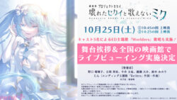 PASH! PLUS 【劇場版プロセカ】野口瑠璃子さん、吉岡茉祐さん、今井文也さん、廣瀬大介さん、鈴木みのりさん、じんさんが登壇! 『劇場版プロジェクトセカイ』舞台挨拶&ライブビューイングが開催決定 映画『劇場版プロジェクトセカイ 壊れたセカイと歌えないミク』の舞台挨拶が10月25日(土)に丸の内ピカデリーにて開催決定。全国の劇場でのライブビューイング実施も発表されました。 『プロジェクトセカイ カラフルステージ! feat. 初... 2025.09.24 PASH! PLUS